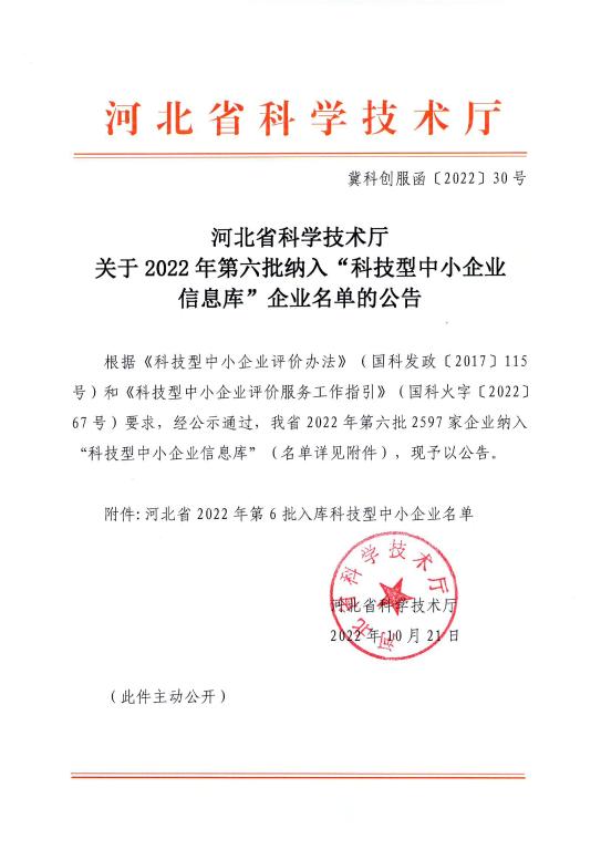 河北省2022年第6批入庫科技型中小企業名單公告正文.jpg PICTURE