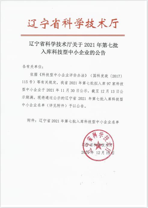 遼寧省2021年第7批入庫(kù)科技型中小企業(yè)名單公告正文.jpg PICTURE