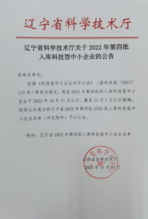 遼寧省2022年第4批入庫科技型中小企業(yè)名單公告