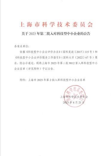 上海市2023年第2批入庫科技型中小企業名單公告正文.jpg PICTURE