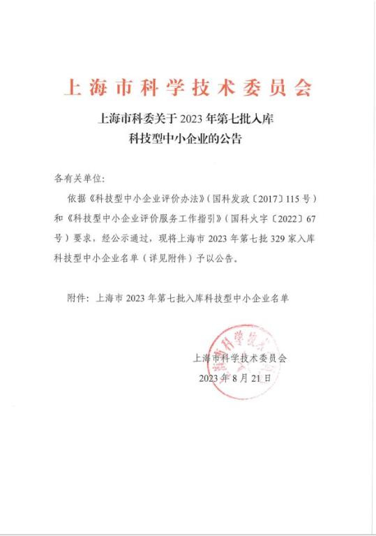 上海市2023年第7批入庫科技型中小企業名單公告正文.jpg PICTURE