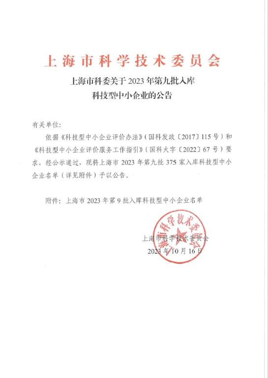 上海市2023年第9批入庫科技型中小企業名單公告正文.jpg PICTURE