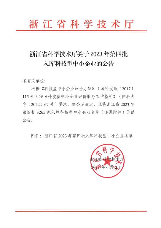 浙江省2023年第4批入庫科技型中小企業(yè)名單公告