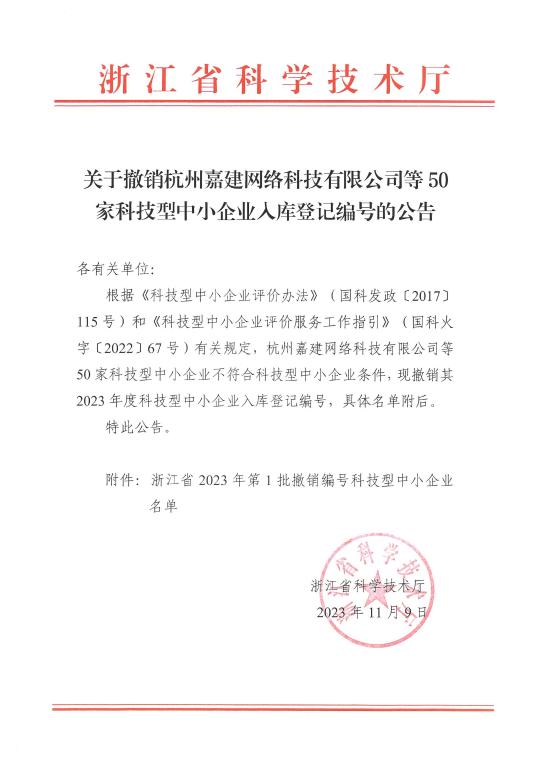 關于撤銷杭州嘉建網絡科技有限公司等50家科技型中小企業入庫登記編號的公告_00.jpg PICTURE