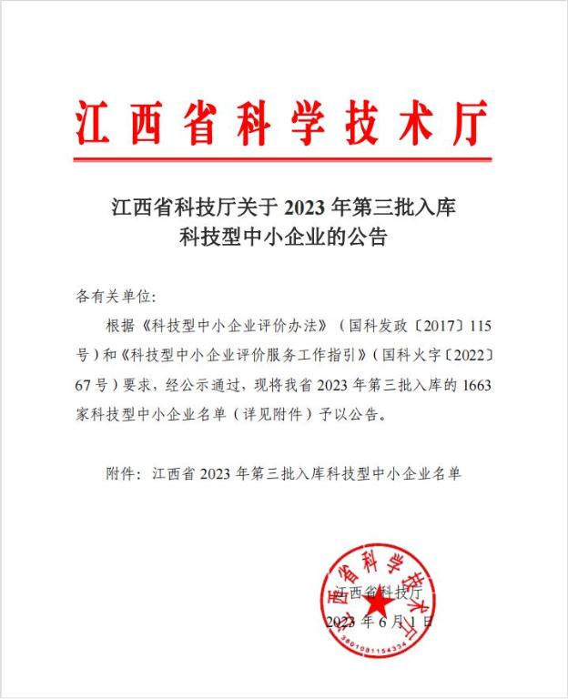 江西省2023年第3批入庫科技型中小企業名單公告正文.jpg PICTURE