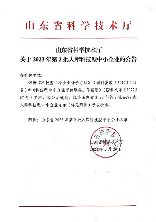 山東省2023年第2批入庫科技型中小企業名單公告正文.jpg PICTURE