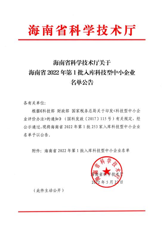 海南省2022年第1批入庫科技型中小企業名單公告正文.jpg PICTURE