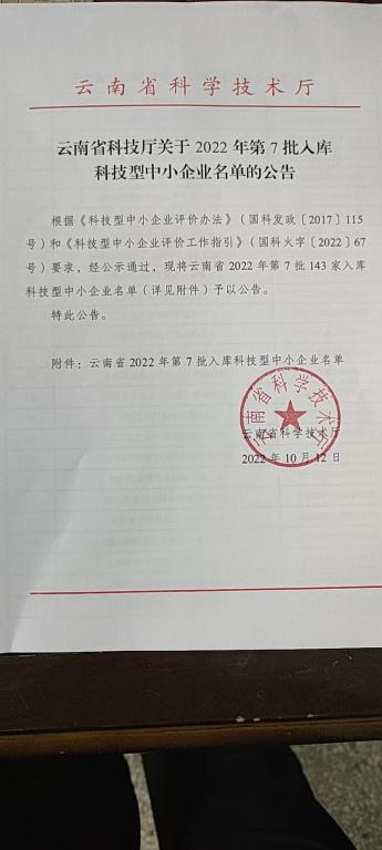 云南省2022年第7批入庫科技型中小企業名單公告正文.jpg PICTURE