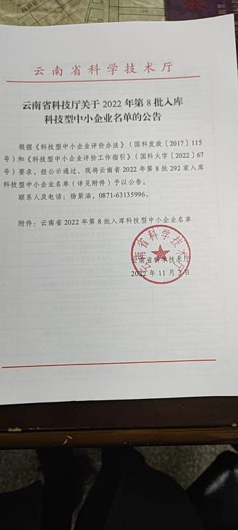云南省2022年第8批入庫科技型中小企業(yè)名單公告