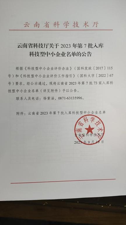 云南省2023年第7批入庫科技型中小企業名單公告正文.jpg PICTURE