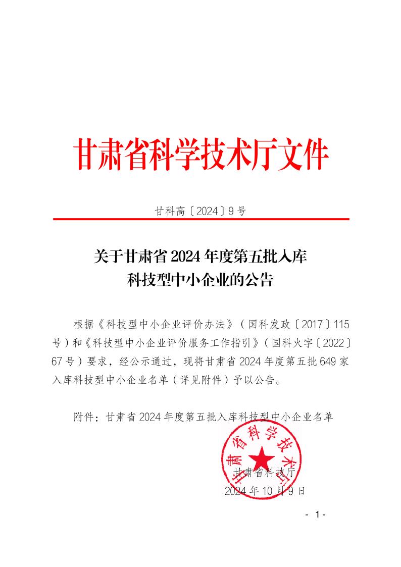 甘肅省2024年第5批入庫科技型中小企業(yè)名單公告