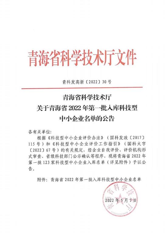 青海省2022年第1批入庫科技型中小企業名單公告正文.jpg PICTURE