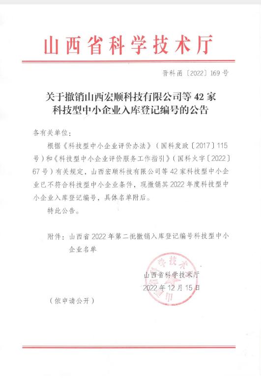 山西省2022年第2批撤銷編號科技型中小企業名單公告正文.jpg PICTURE