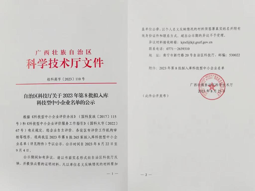 廣西壯族自治區(qū)2023年第8批擬入庫科技型中小企業(yè)名單公示