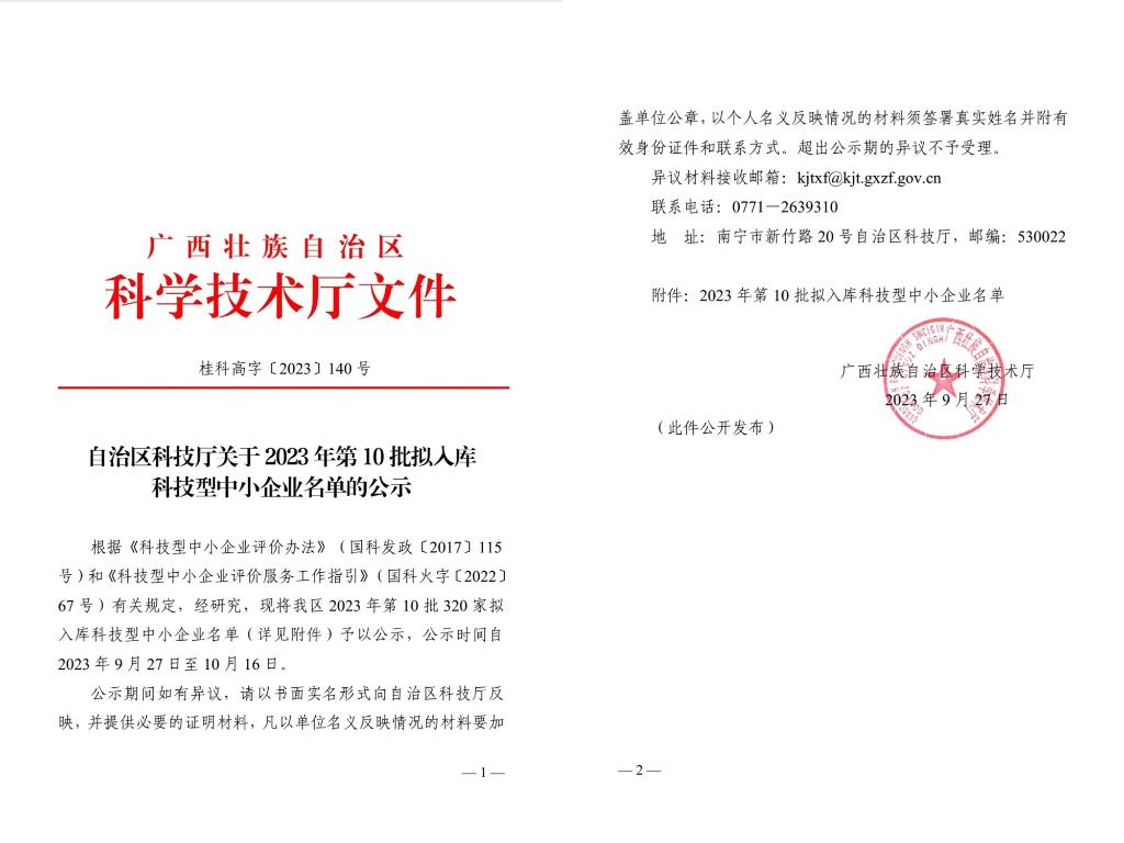 廣西壯族自治區2023年第10批擬入庫科技型中小企業名單公示正文.jpg PICTURE