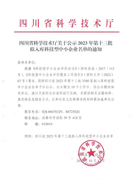 四川省2023年第13批擬入庫科技型中小企業(yè)名單公示