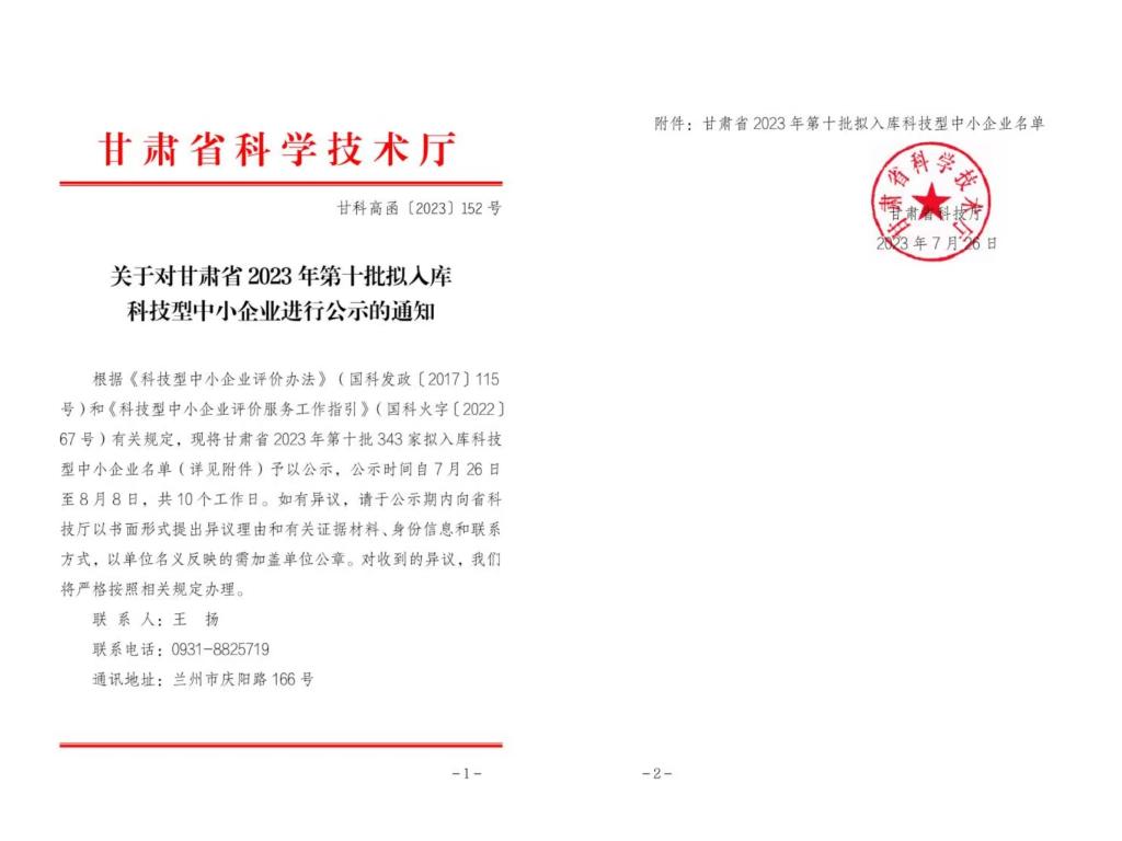 甘肅省2023年第10批擬入庫科技型中小企業(yè)名單公示