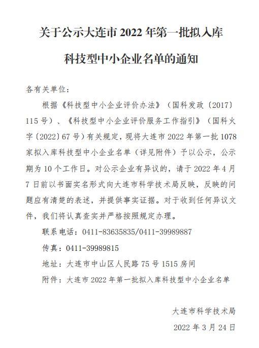 大連市2022年第1批擬入庫科技型中小企業(yè)名單公示