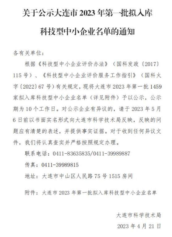 大連市2023年第1批擬入庫科技型中小企業名單公示正文.jpg PICTURE