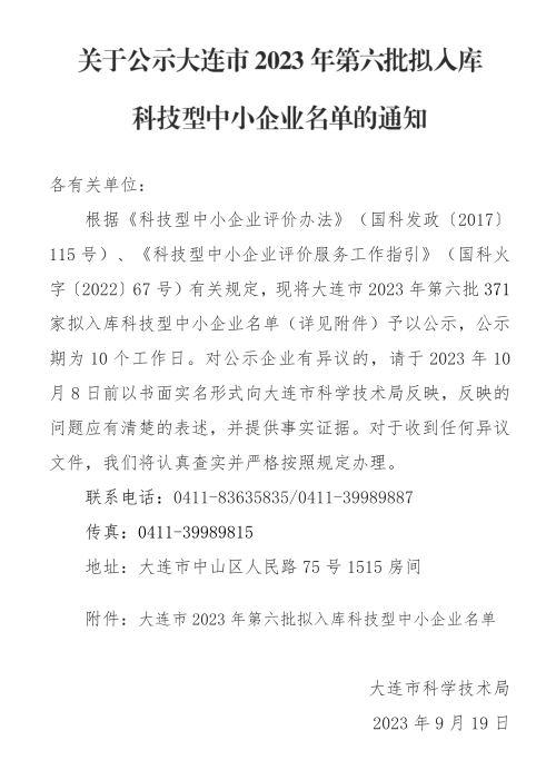 大連市2023年第6批擬入庫科技型中小企業名單公示正文.jpg PICTURE